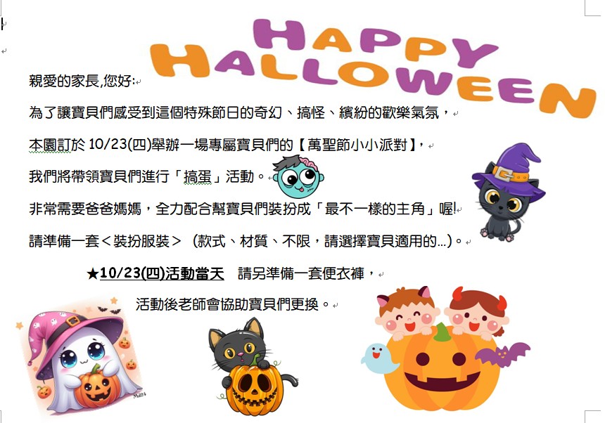 本園訂於10/23(四)舉辦一場專屬寶貝們的【萬聖節小小派對】,我們將帶領寶貝們進行「搞蛋」活動。非常需要爸爸媽媽,全力配合幫寶貝們裝扮成「最不一樣的主角」喔!