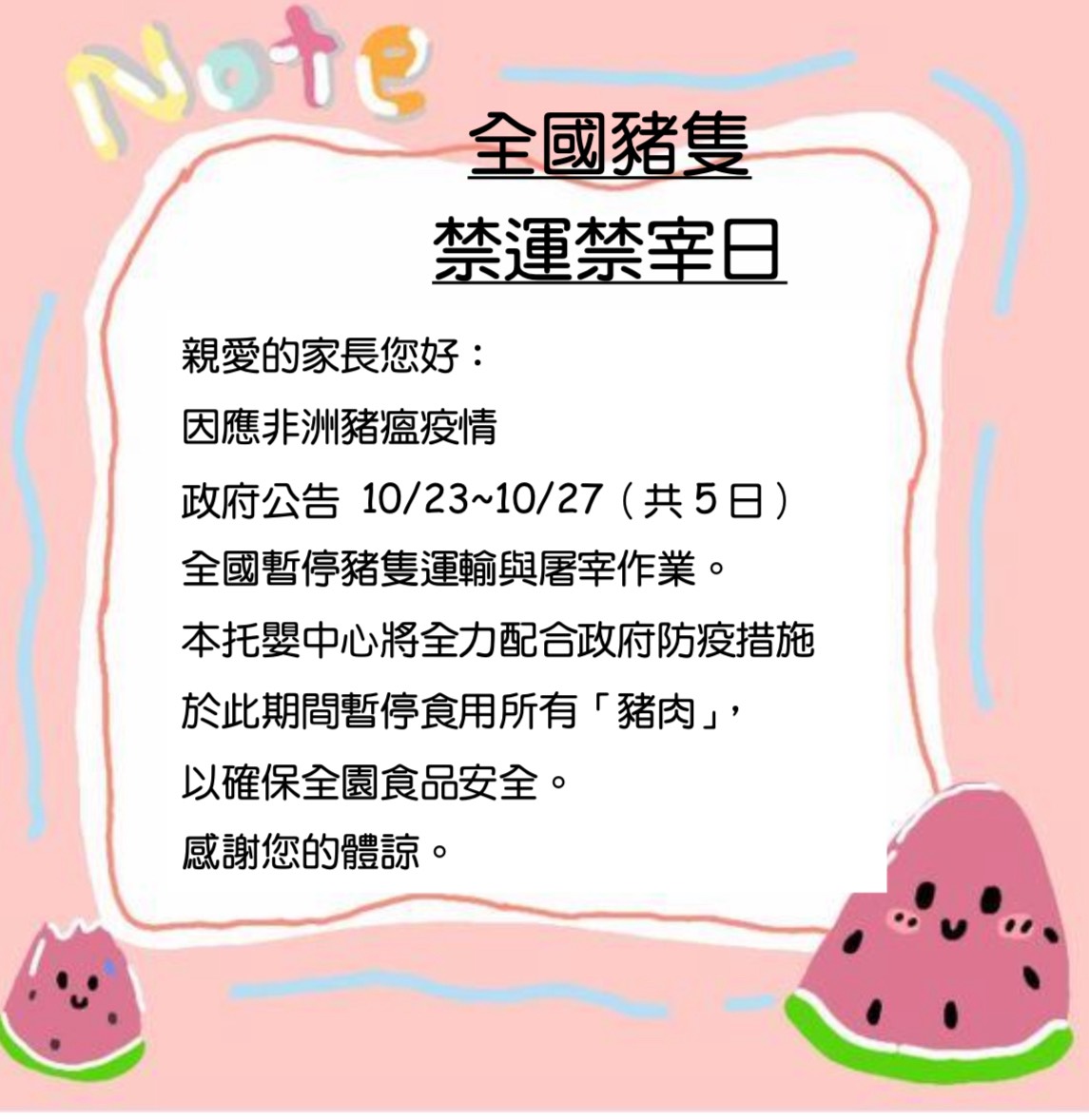 10/23-10/27全國豬隻禁運禁宰日